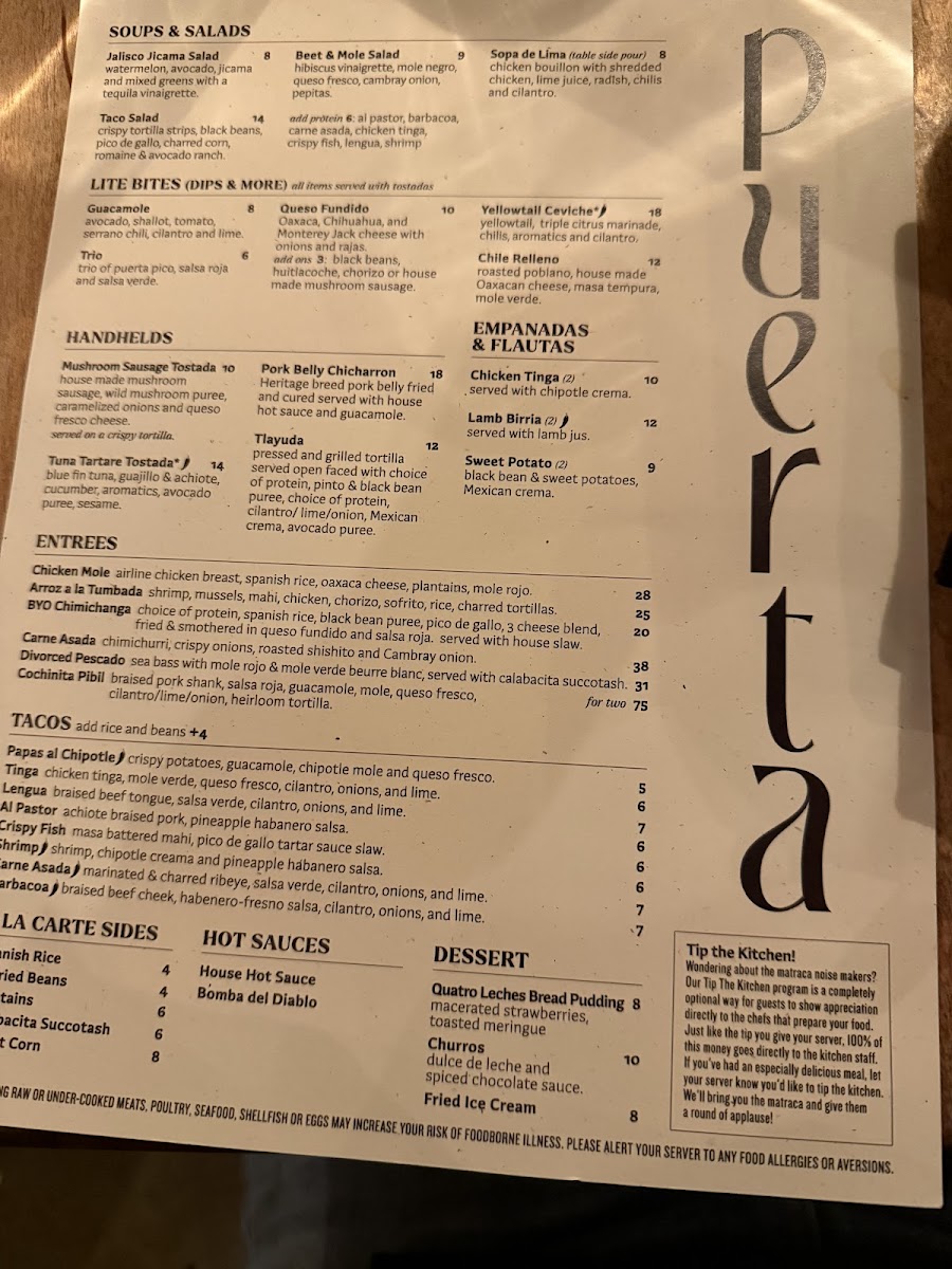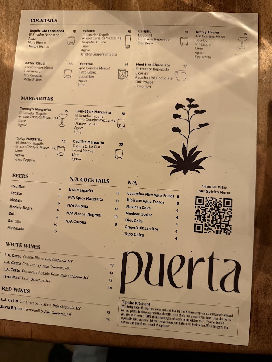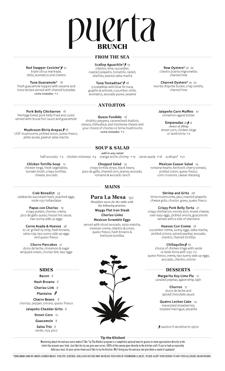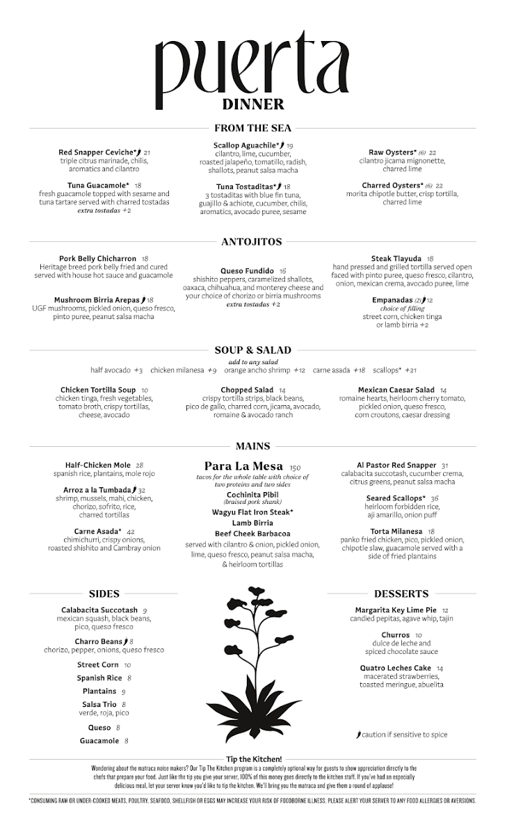 Puerta’s menu offers a thoughtful selection of Mexican-inspired dishes and crafted cocktails designed for sharing and savoring in a lively yet comfortable setting. Whether you’re stopping by for vibrant small plates or evening cocktails, the menu balances familiar comfort with subtle twists that invite exploration.